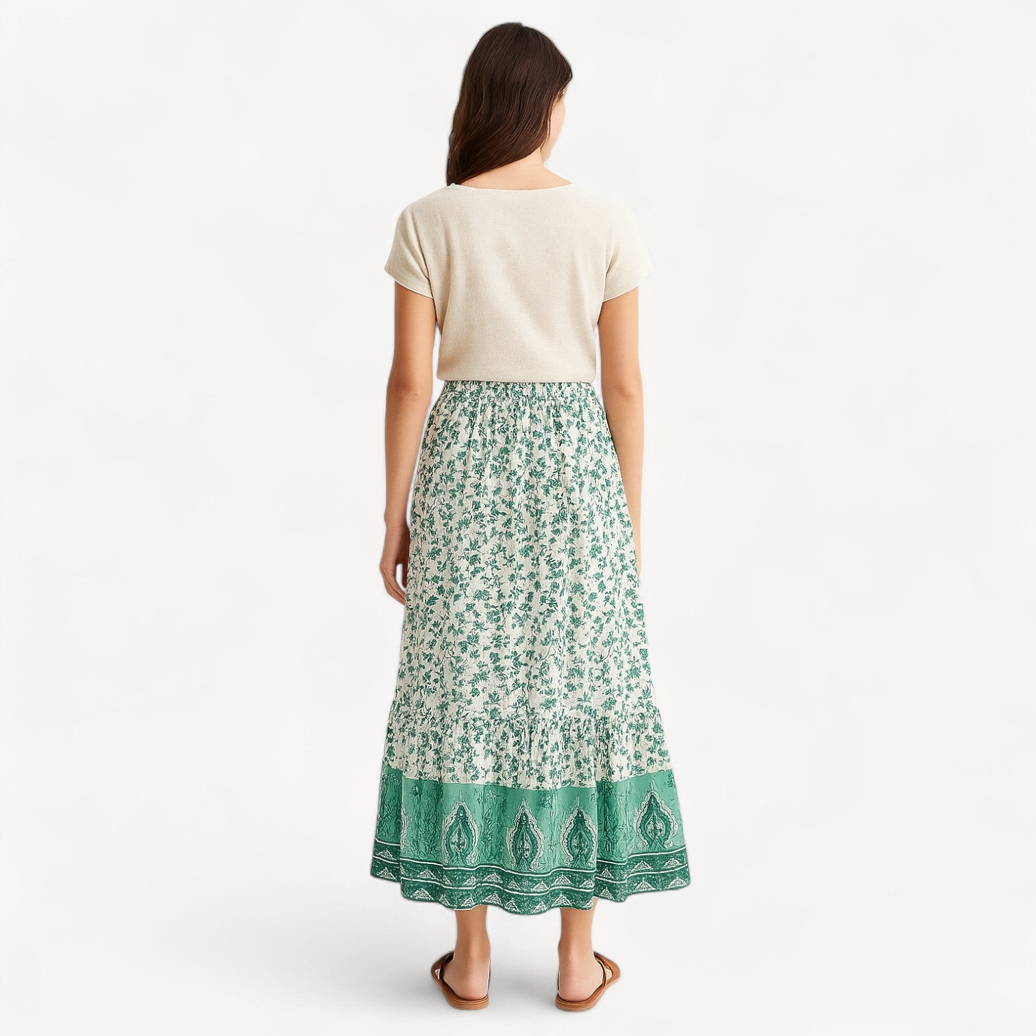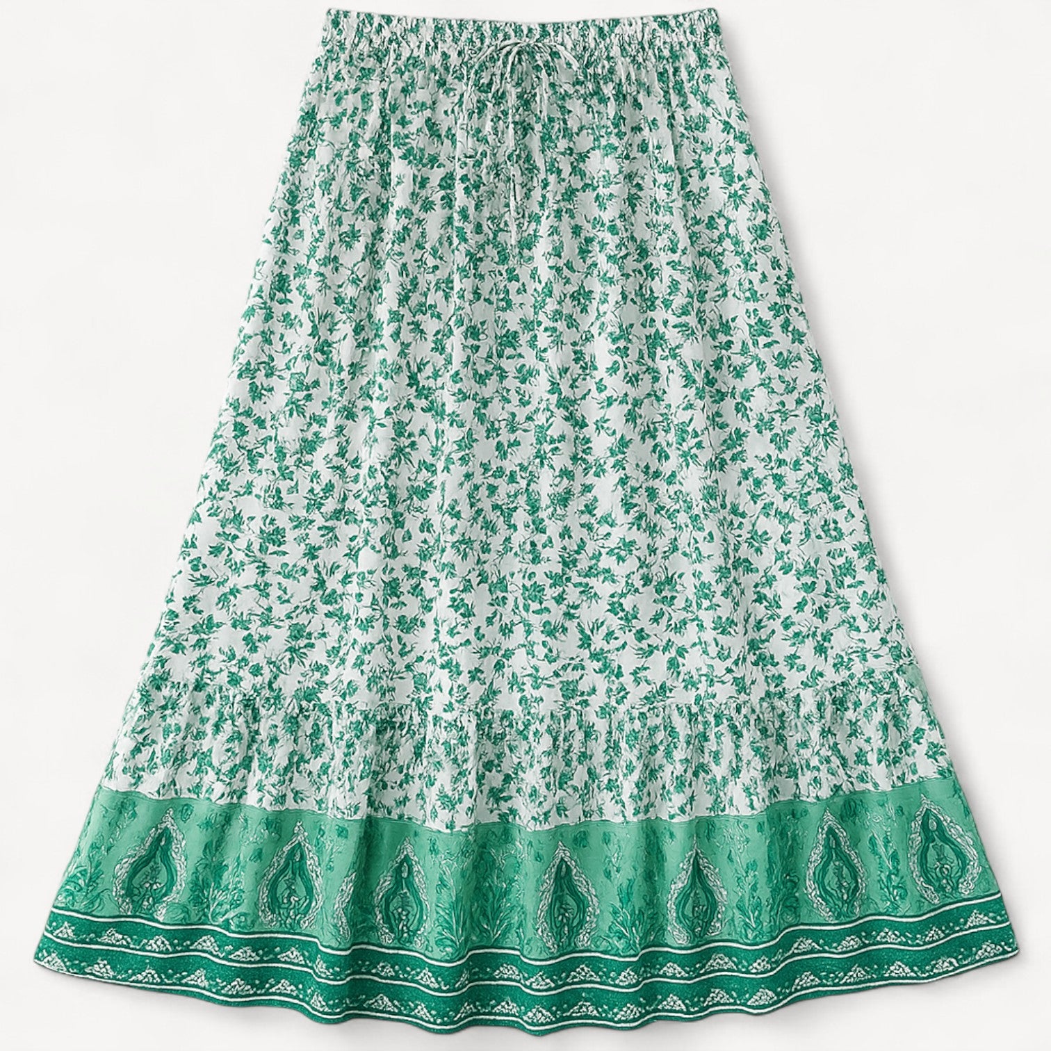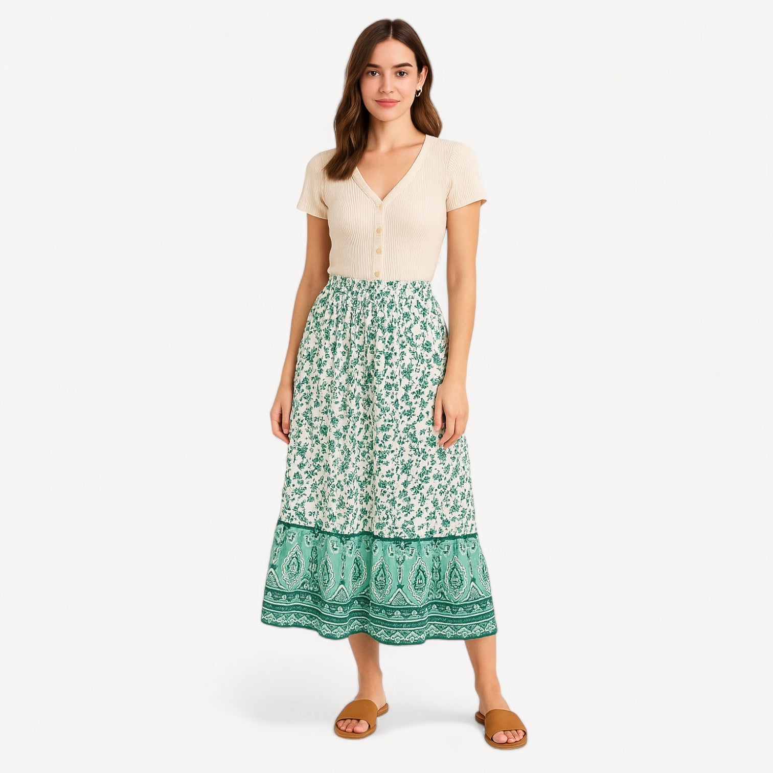 Davies | Floral Boho Midi Skirt with Elastic Waist & Border Hem