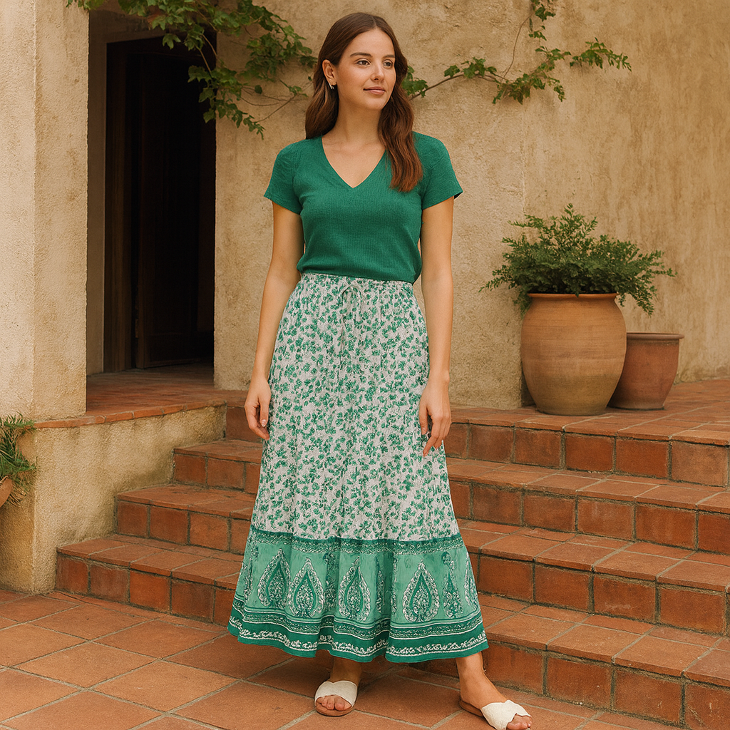 Meet your go‑to summer skirt: a breezy, boho‑inspired midi with an all‑over green floral print and a statement border hem. The pull‑on elastic waistband with adjustable drawstring delivers a comfy, flexible fit, while the gently tiered silhouette skims the body for an easy A‑line drape. Lightweight with beautiful movement, this skirt pairs effortlessly with tees, camis, or knits—perfect for holidays, brunch, markets, and everything in between.