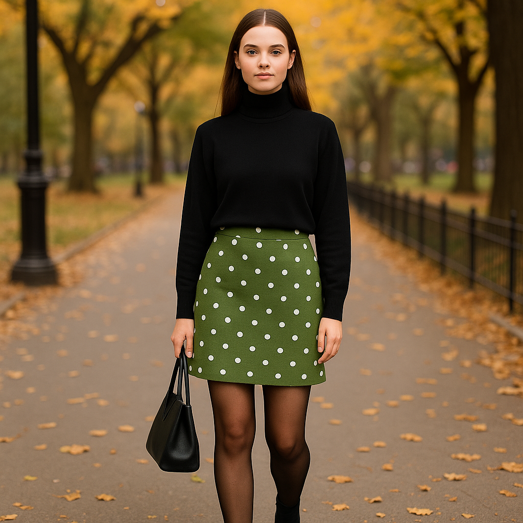 Choose classic black, ivory, or olive green to anchor your wardrobe year-round. The playful polka dot pattern pairs with everything from cozy knits to sharp blazers, making this skirt a go-to for polished everyday looks.