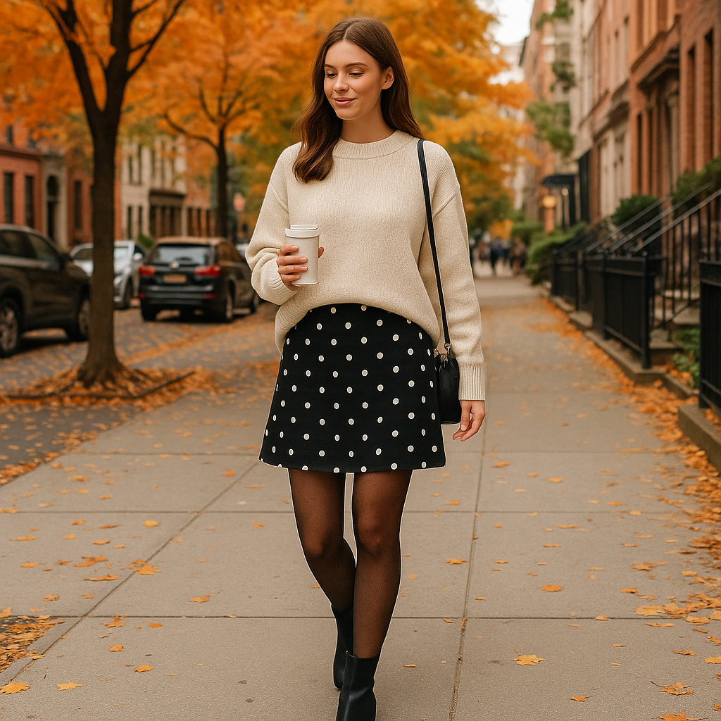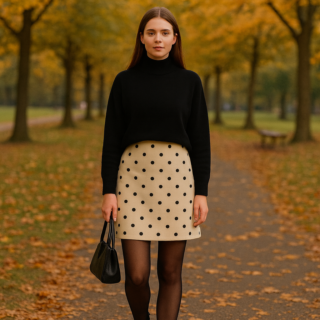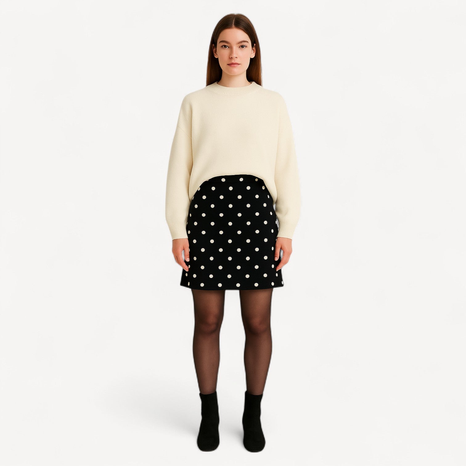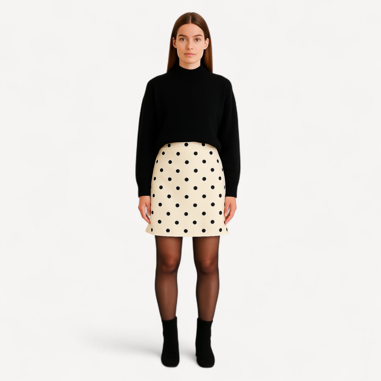 A high-waist polka dot skirt that combines retro charm with a refined silhouette. Designed for versatile styling, its flattering A-line cut ensures an easy fit that transitions seamlessly from casual afternoons to elevated evenings.
