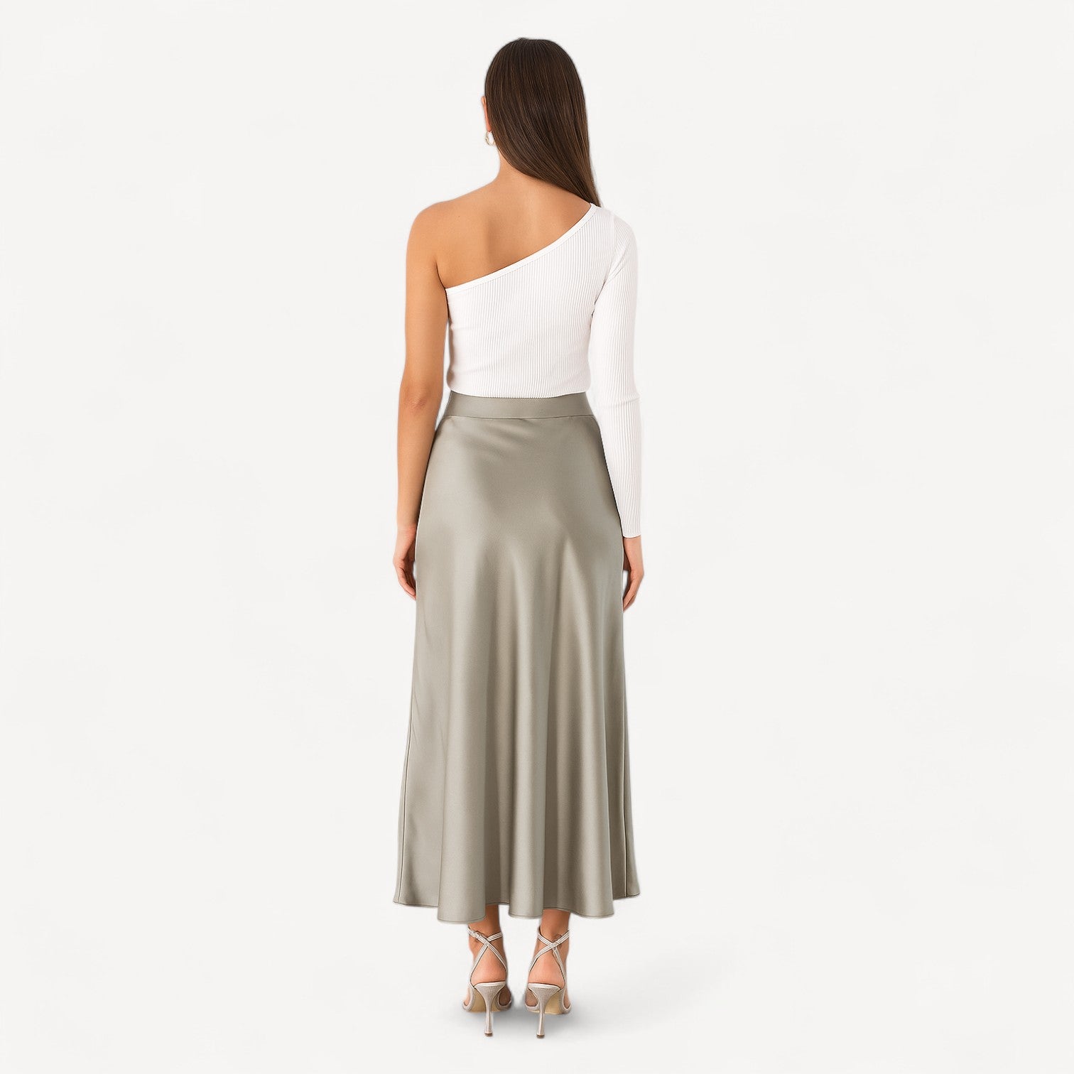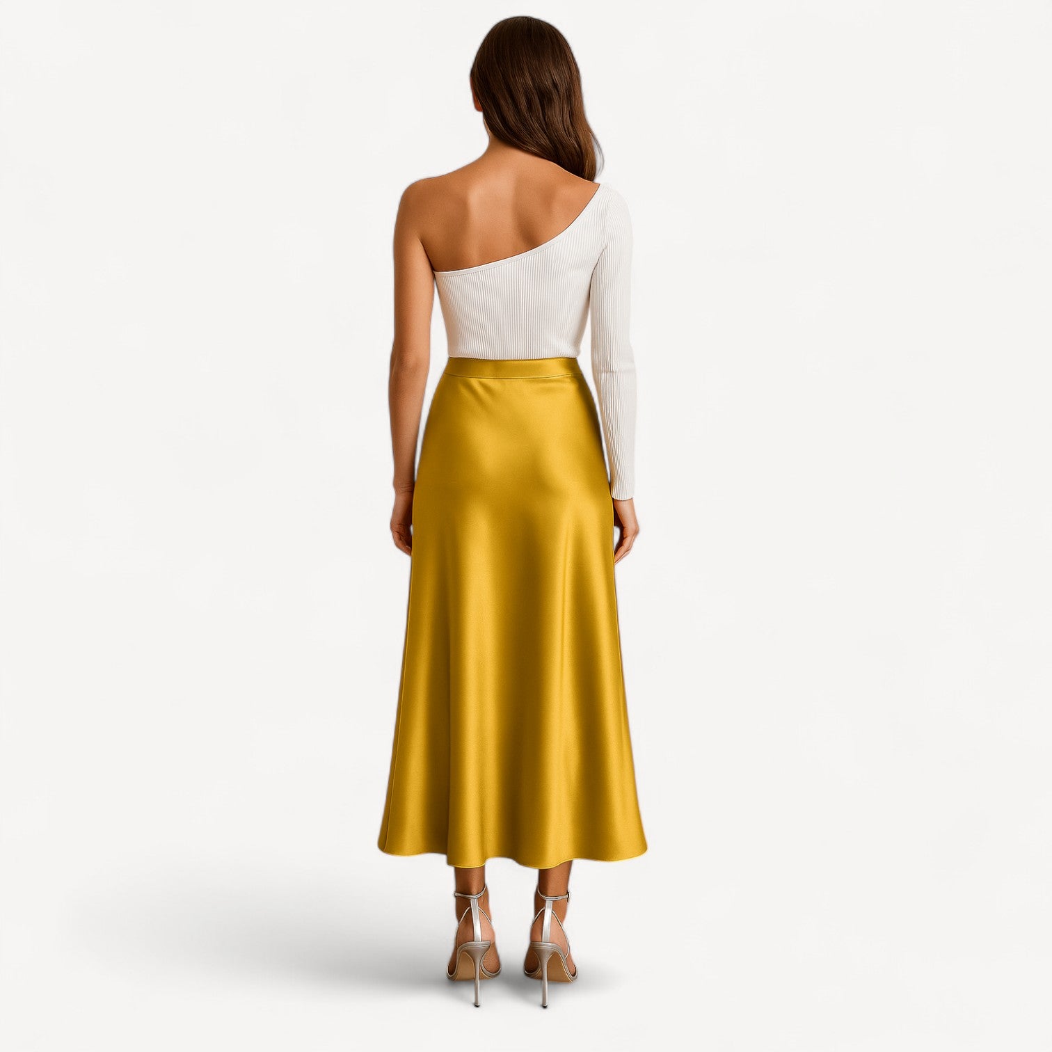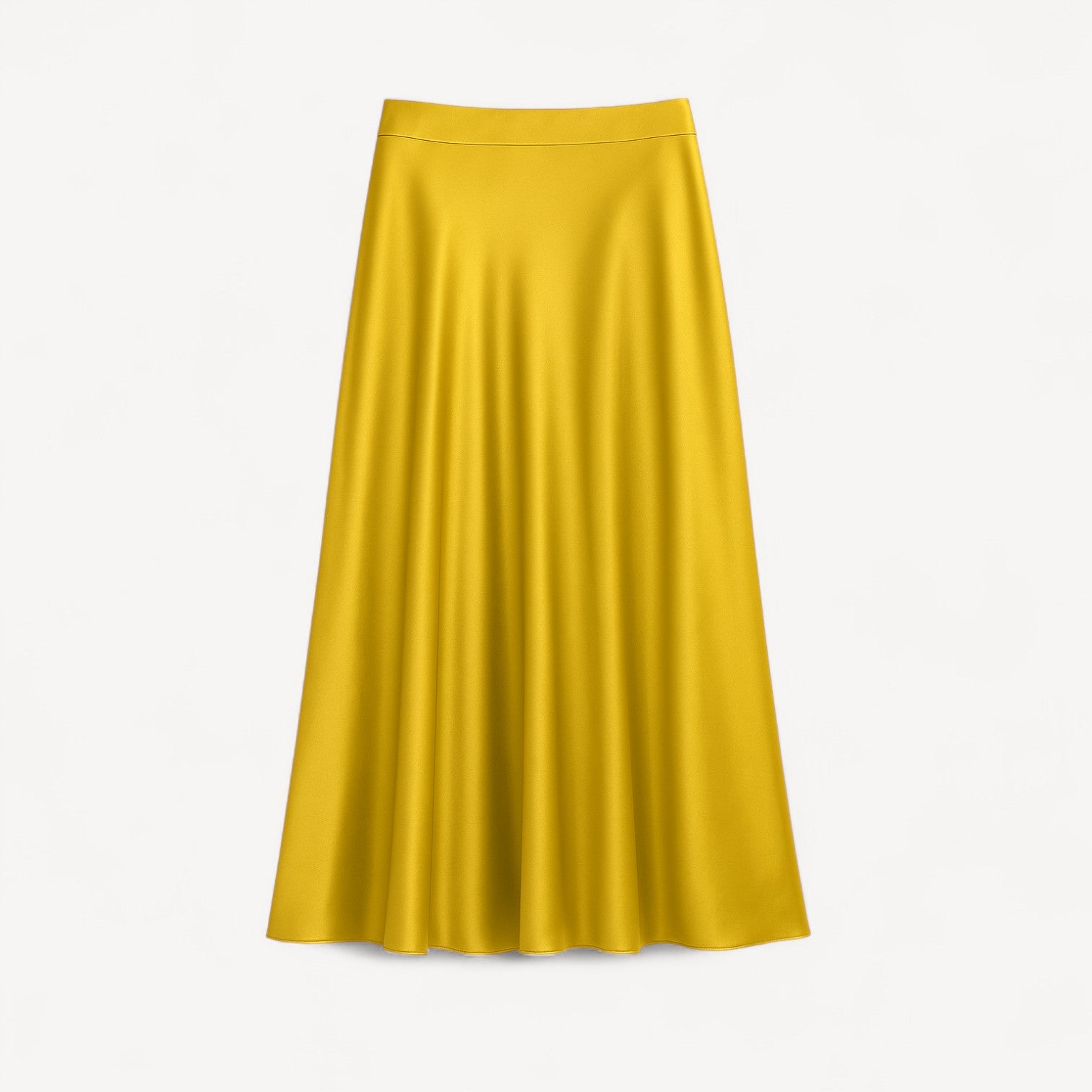 A silk midi skirt cut on the bias to skim—never cling—the figure. The high, smooth waistband and softly flared A-line create a long, elegant line, while the silk’s lustrous sheen brings subtle glamour from daylight to dinner.
