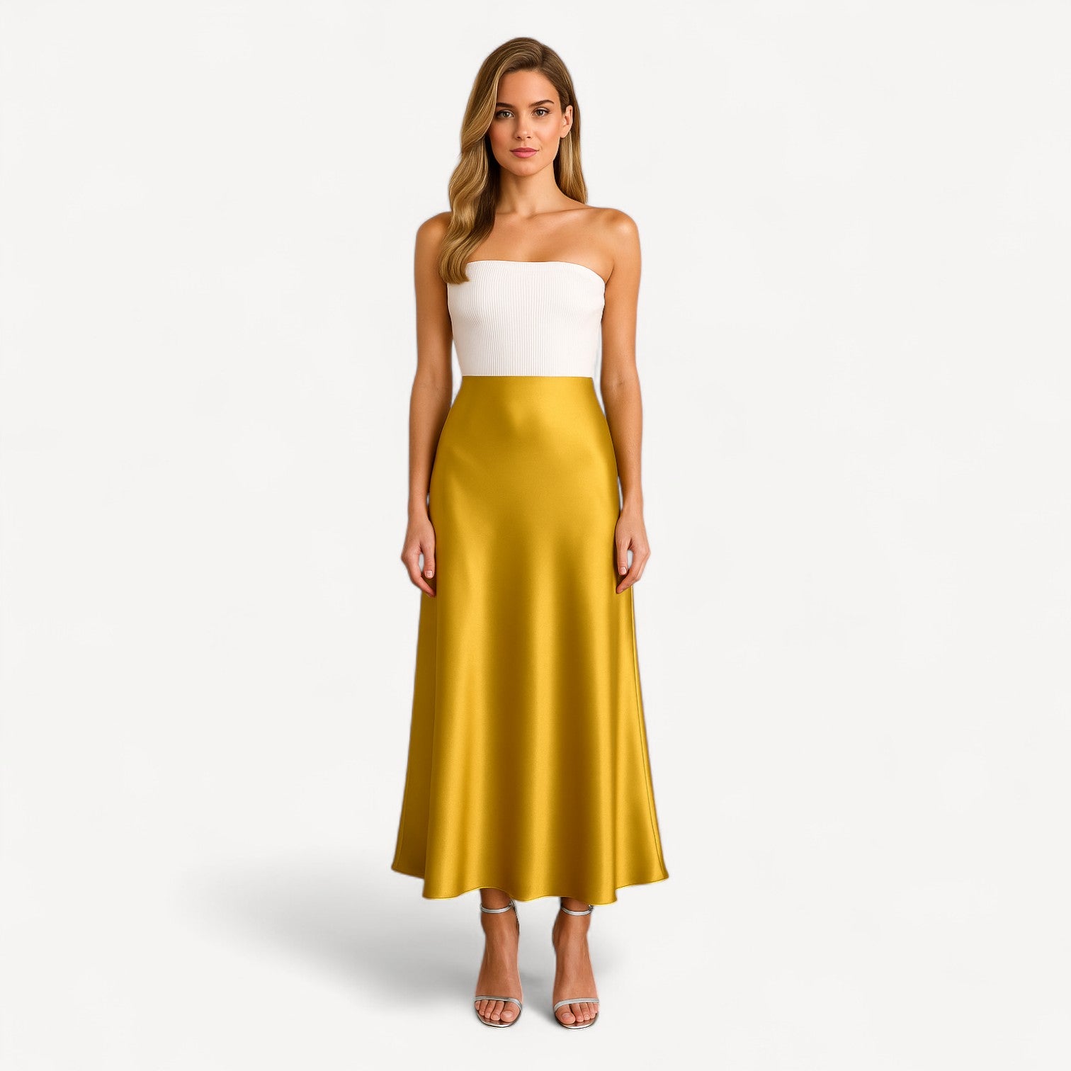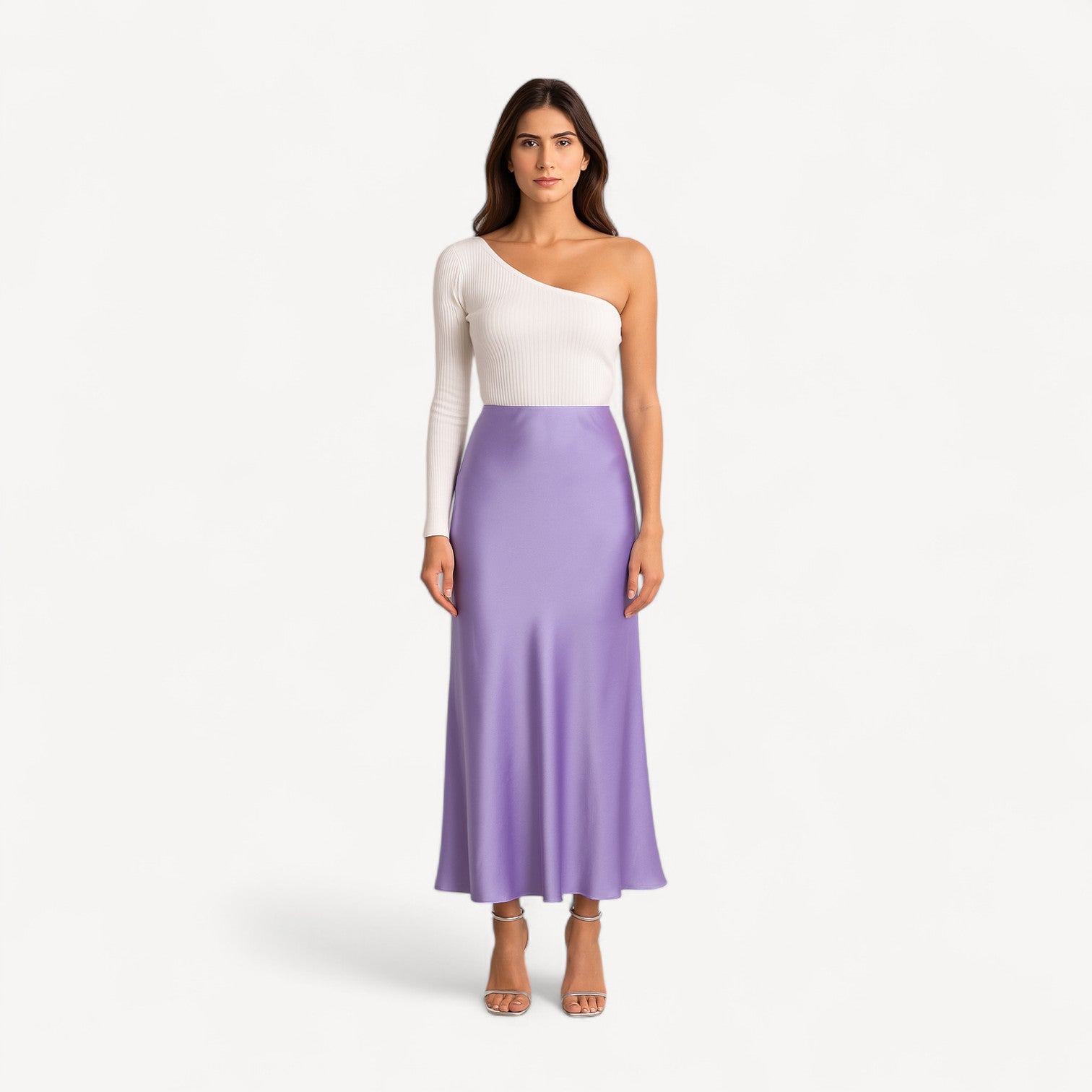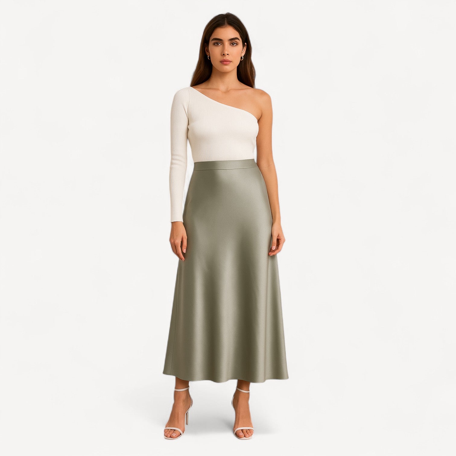 A silk midi skirt cut on the bias to skim—never cling—the figure. The high, smooth waistband and softly flared A-line create a long, elegant line, while the silk’s lustrous sheen brings subtle glamour from daylight to dinner.