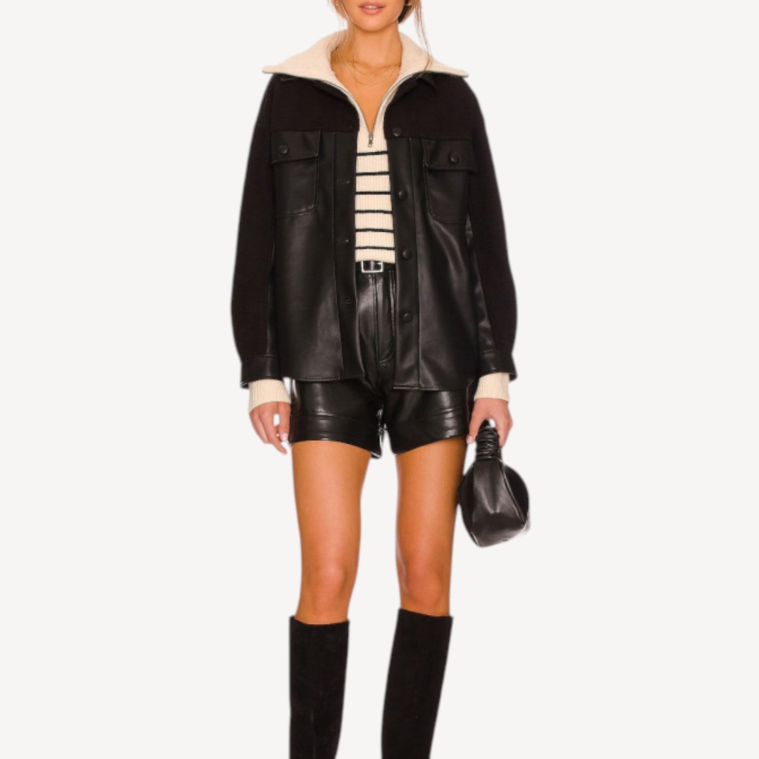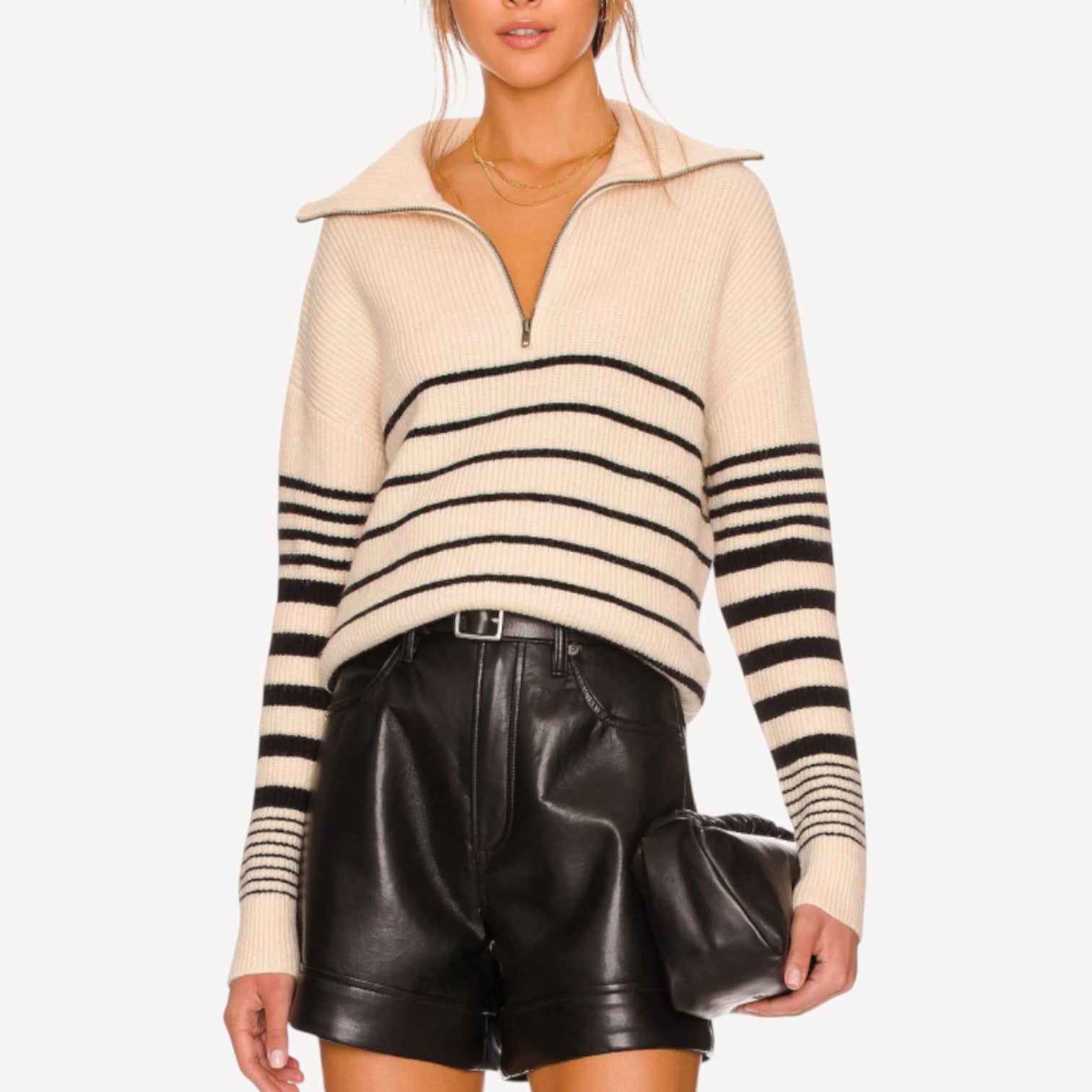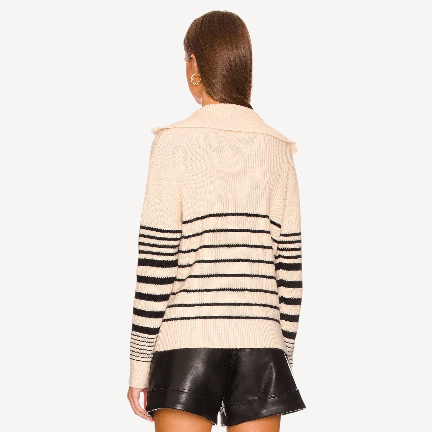 Perfect for layering under jackets or styling with jeans, leather shorts, or skirts, this striped knit sweater blends comfort and sophistication for effortless everyday wear.