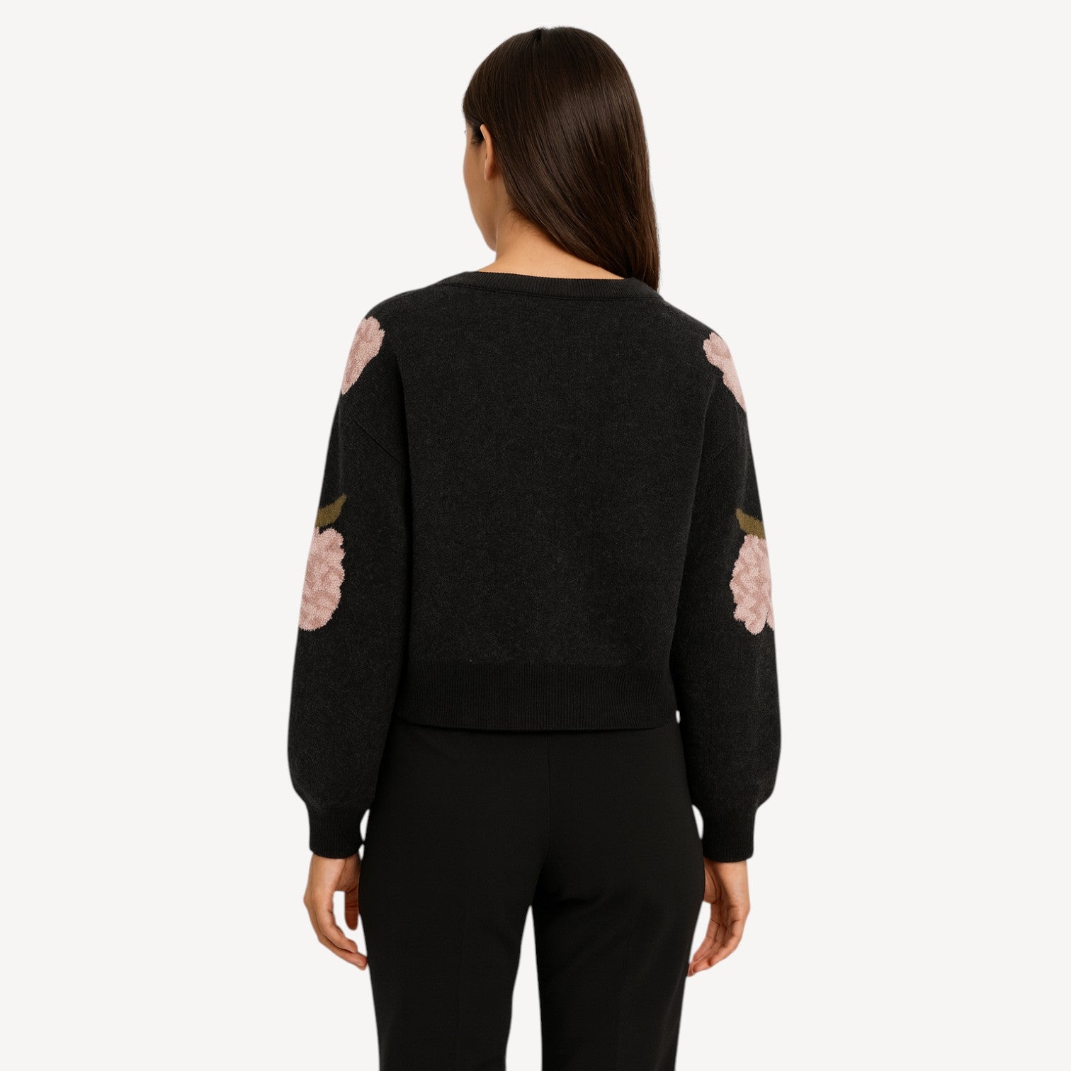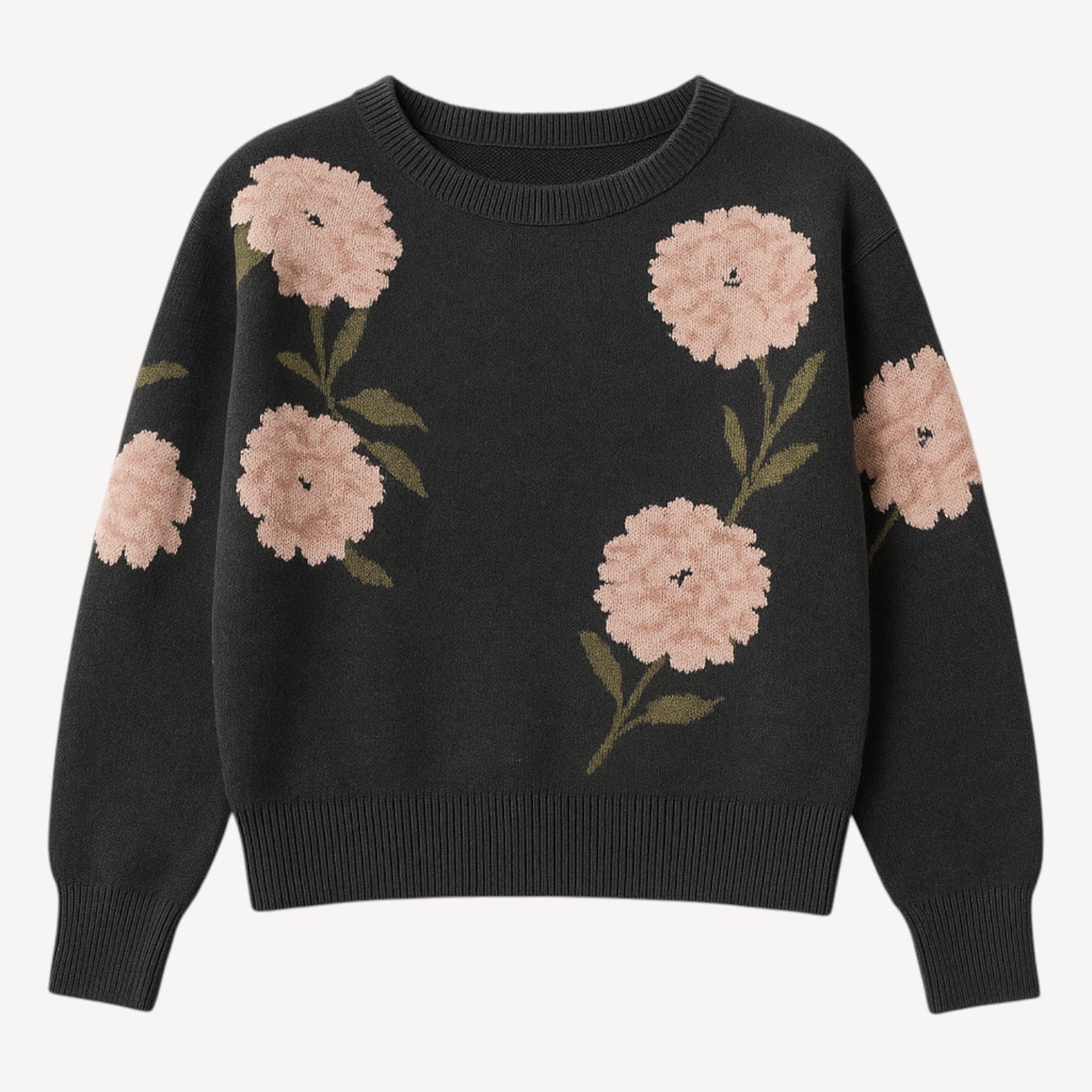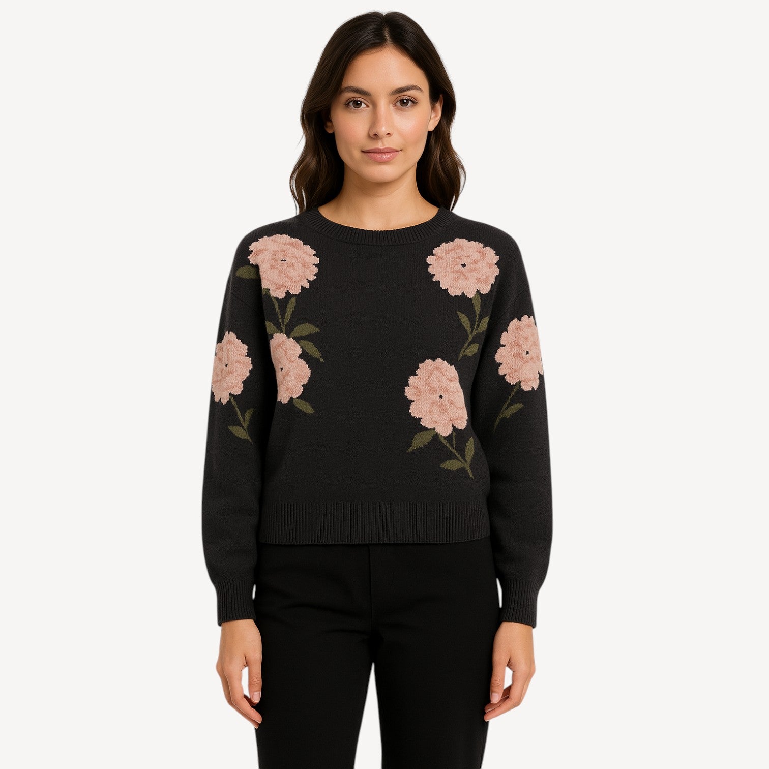 Elevate your wardrobe with this chic women sweater featuring delicate floral embroidery in soft blush tones against a classic black base. Designed with a round neckline, ribbed hems, and a cozy knitted texture, this pullover blends timeless elegance with everyday comfort.
