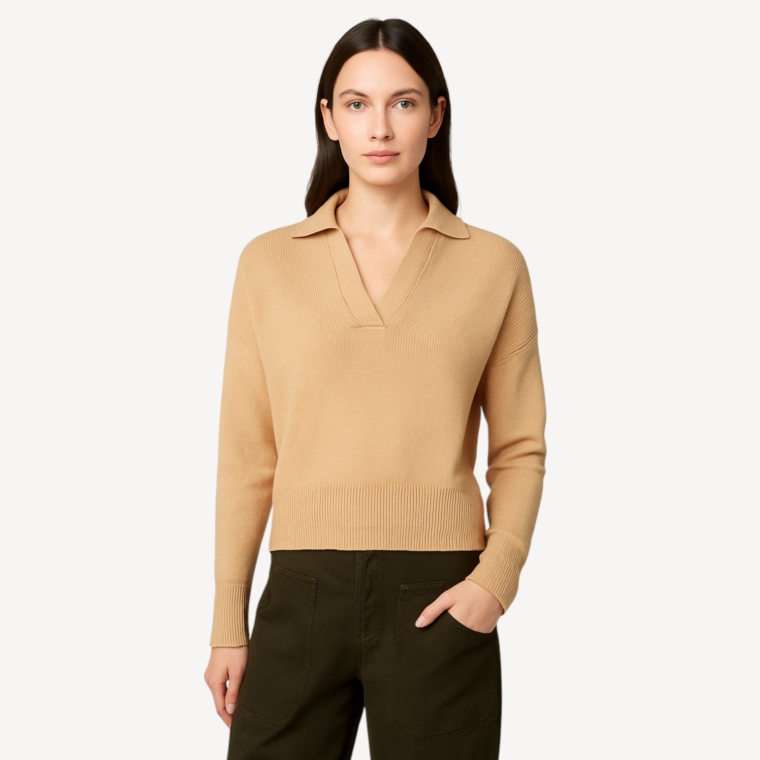 Elevate your everyday look with this timeless camel knit women sweater. Designed with a flattering V-neckline and soft collar, it blends casual elegance with effortless comfort. The ribbed hem and cuffs provide a polished finish, while the relaxed fit makes it easy to style for work, weekends, or cozy evenings.
