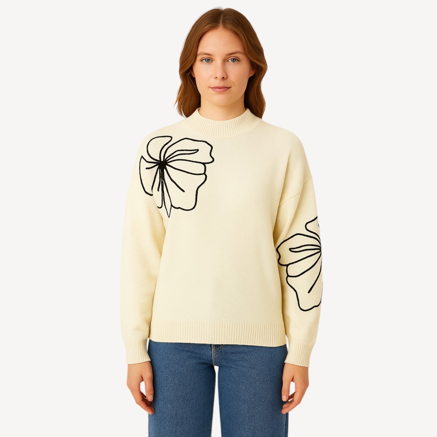 Soft cream knitted sweater with bold floral embroidery