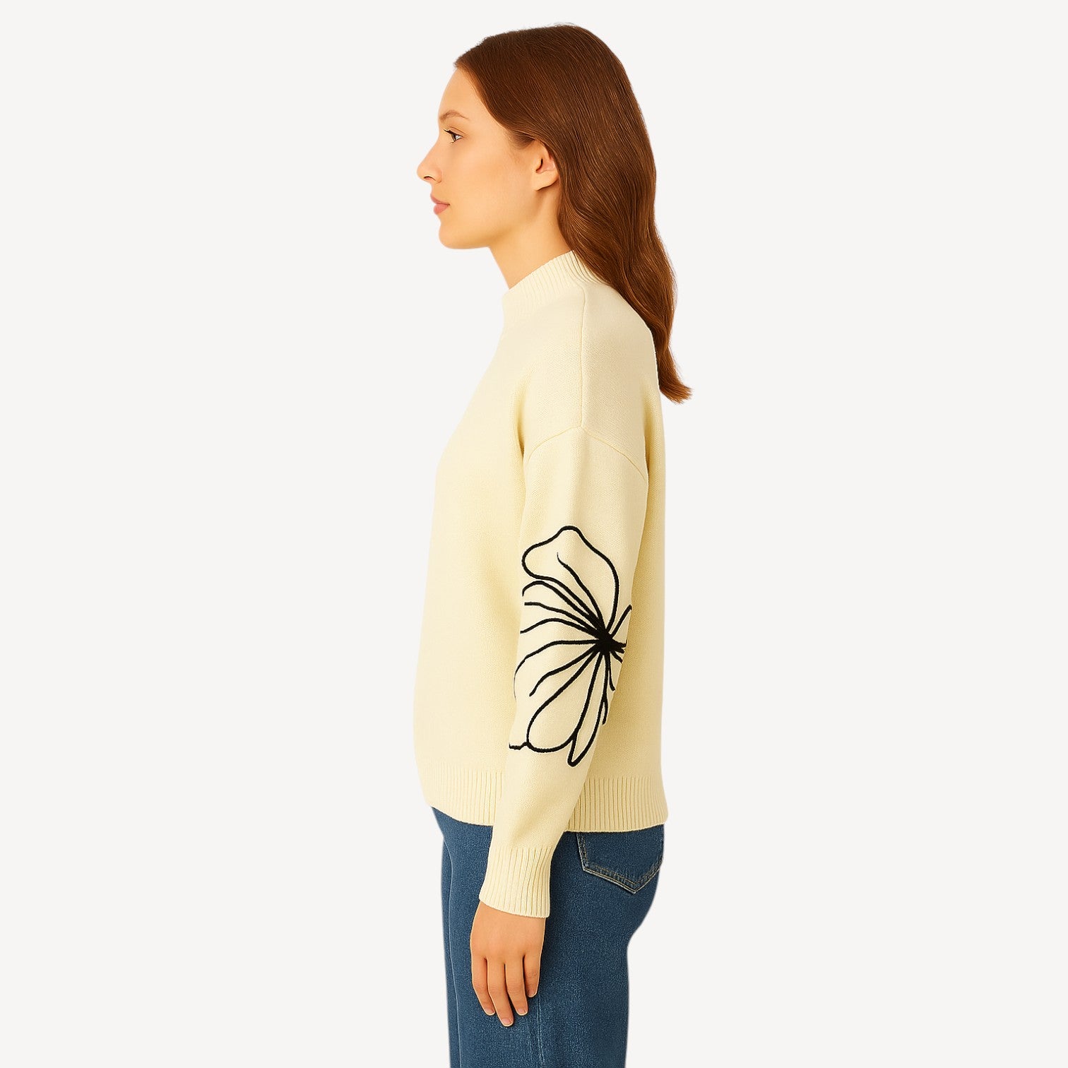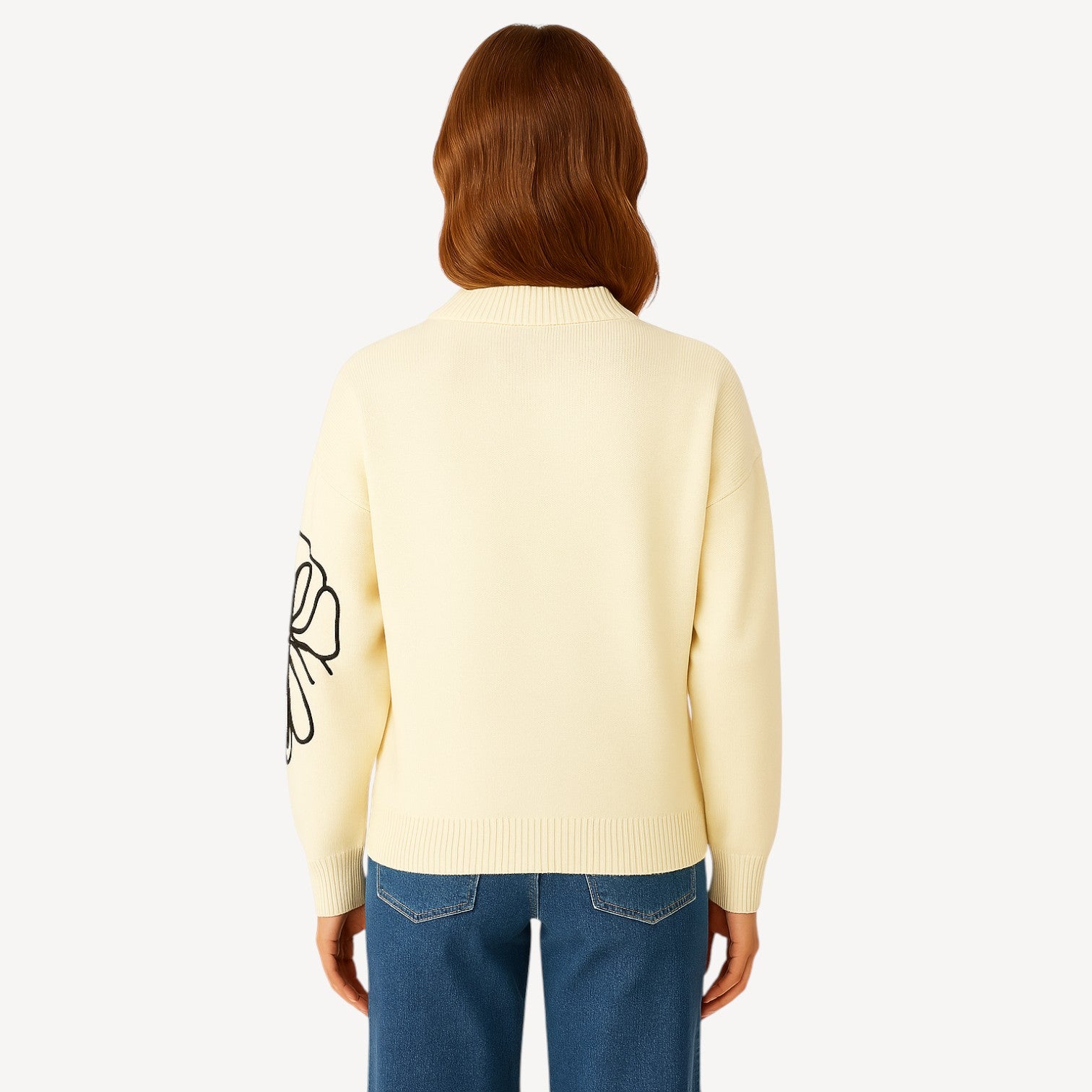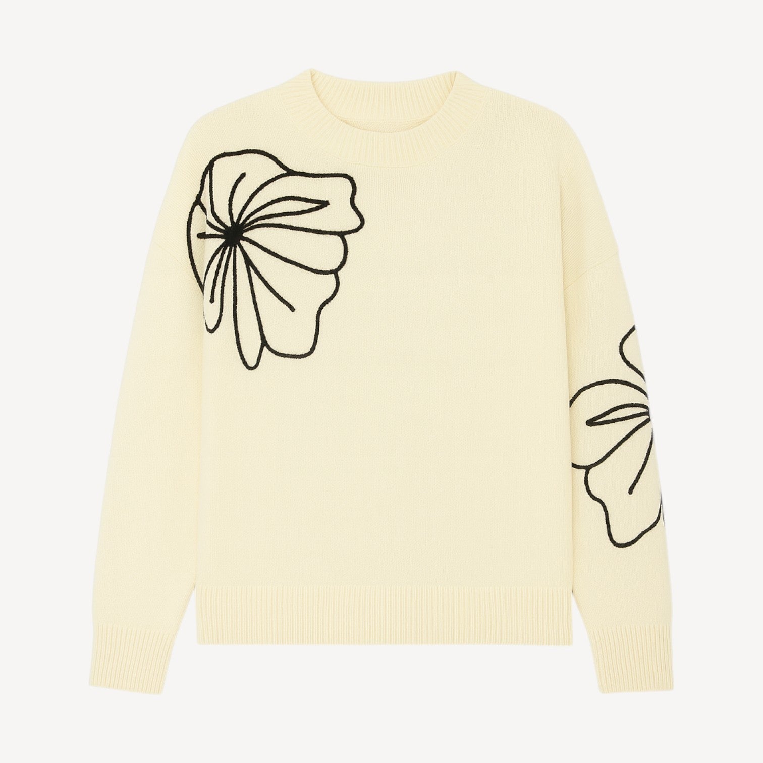 Elevate your wardrobe with this chic cream knitted sweater featuring oversized black floral embroidery for a modern statement look. Crafted with a cozy knit and ribbed hems, this sweater blends comfort with elegance. Its relaxed fit makes it perfect for layering over jeans, skirts, or trousers, giving you versatile styling options for both casual and polished outfits.