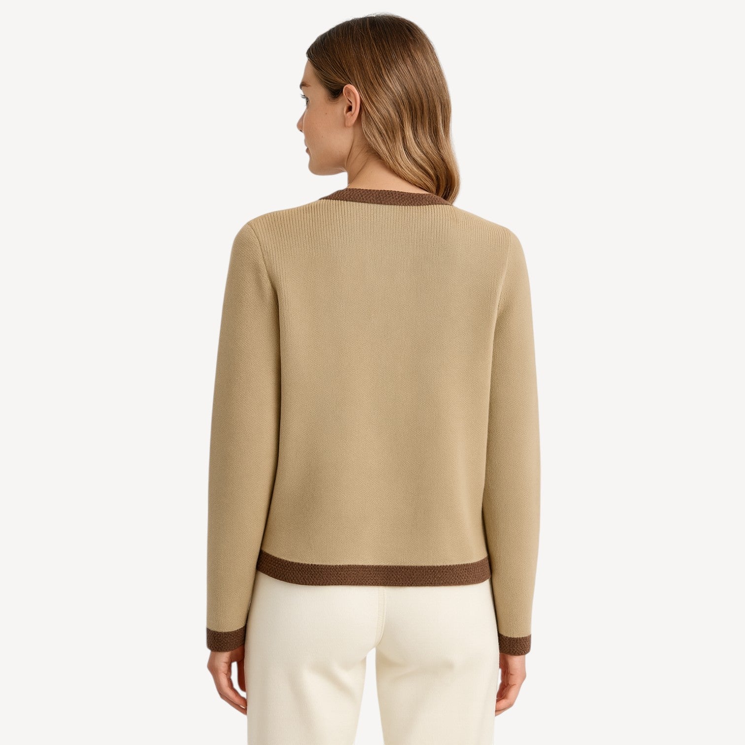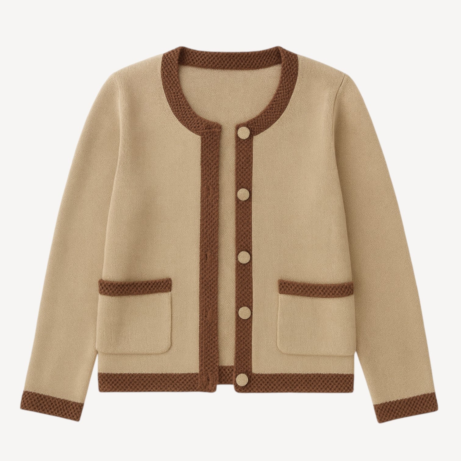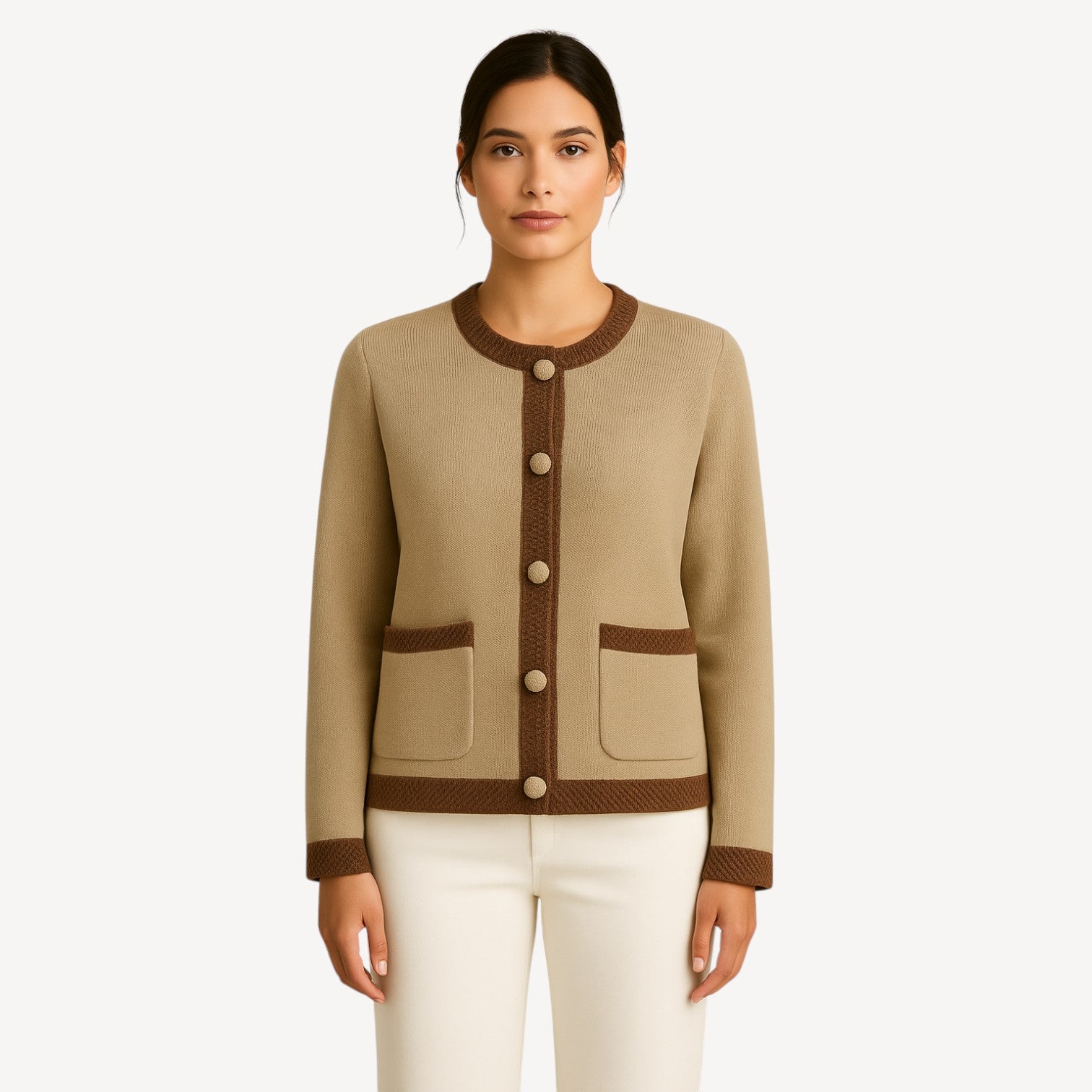 Davies | Women’s Knitted Cardigan Beige with Contrast Trim & Pockets