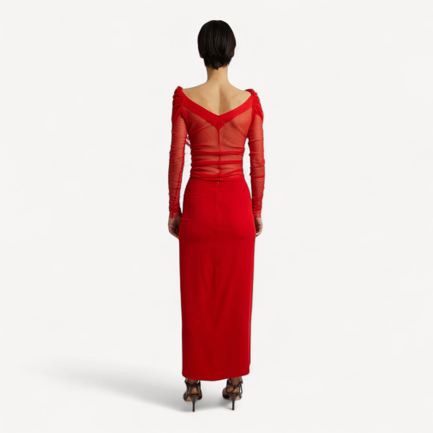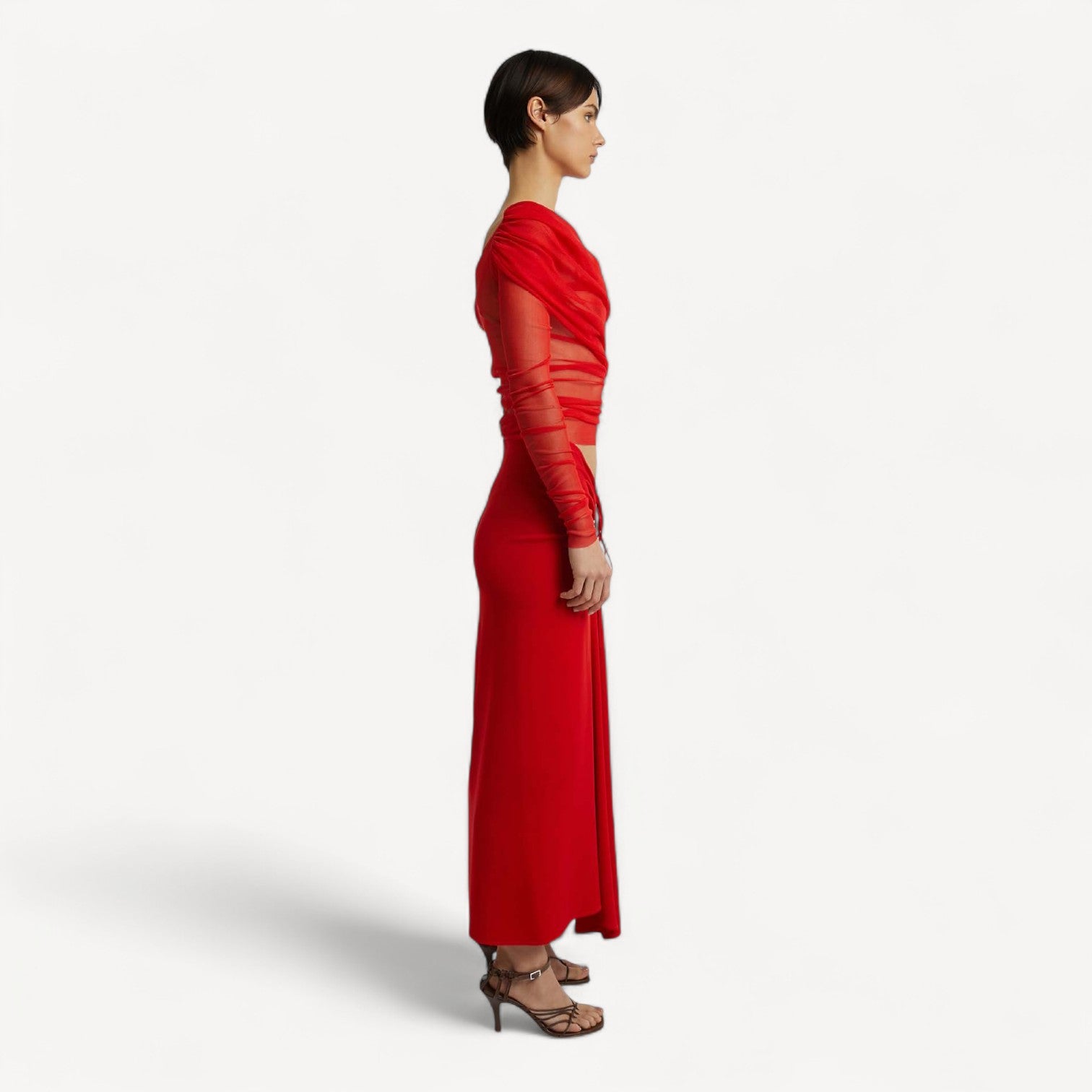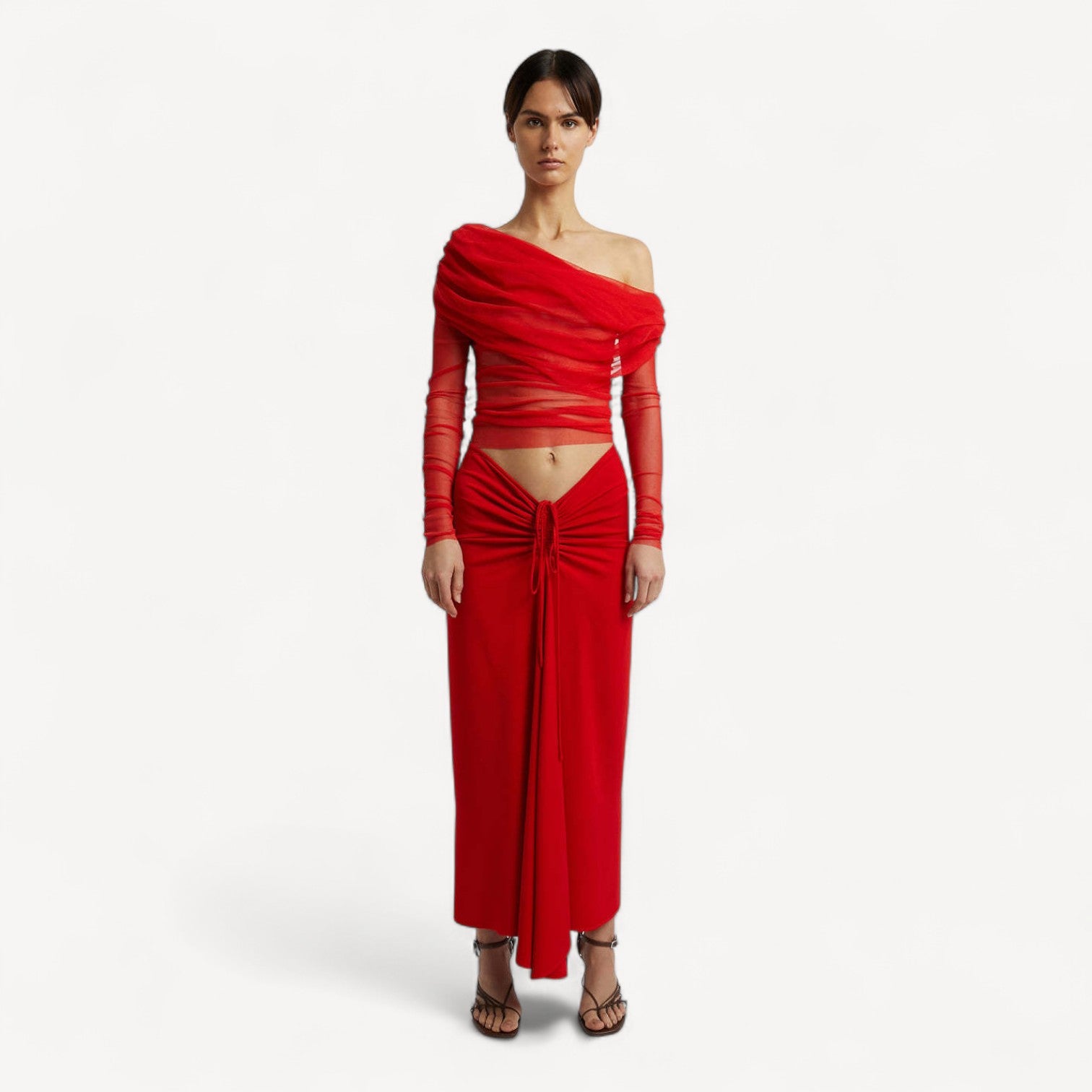 Davies | Off Shoulder Mesh Long Sleeve Going Out Top – Red, Beige, Coffee & Black
