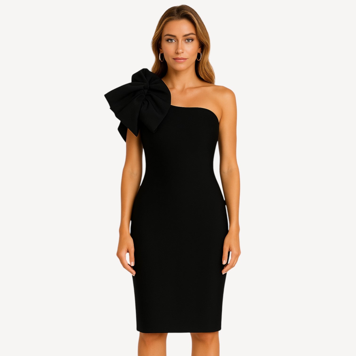 A striking red dress and timeless black option, designed for sophistication and impact. The one-shoulder silhouette is elevated with an oversized sculptural bow, while the sleek midi length creates an effortlessly elegant fit. Ideal for cocktail parties, evening events, and special occasions.